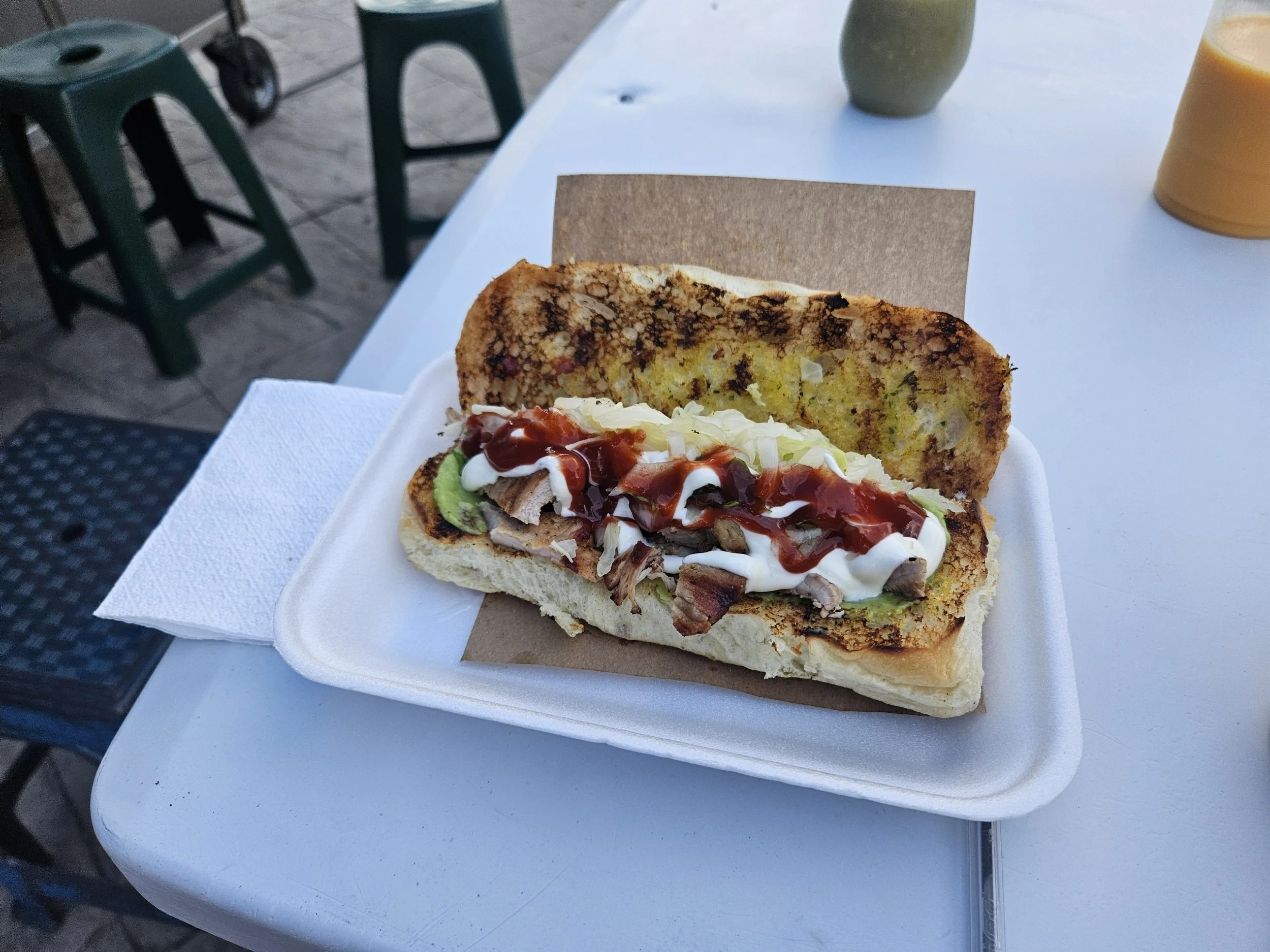 Buffalo sandwich - This amazing sandwich starts with toasted bread then adds: beans, meat, onions, cabbage, ranch dressing, and a cilantro garlic mix