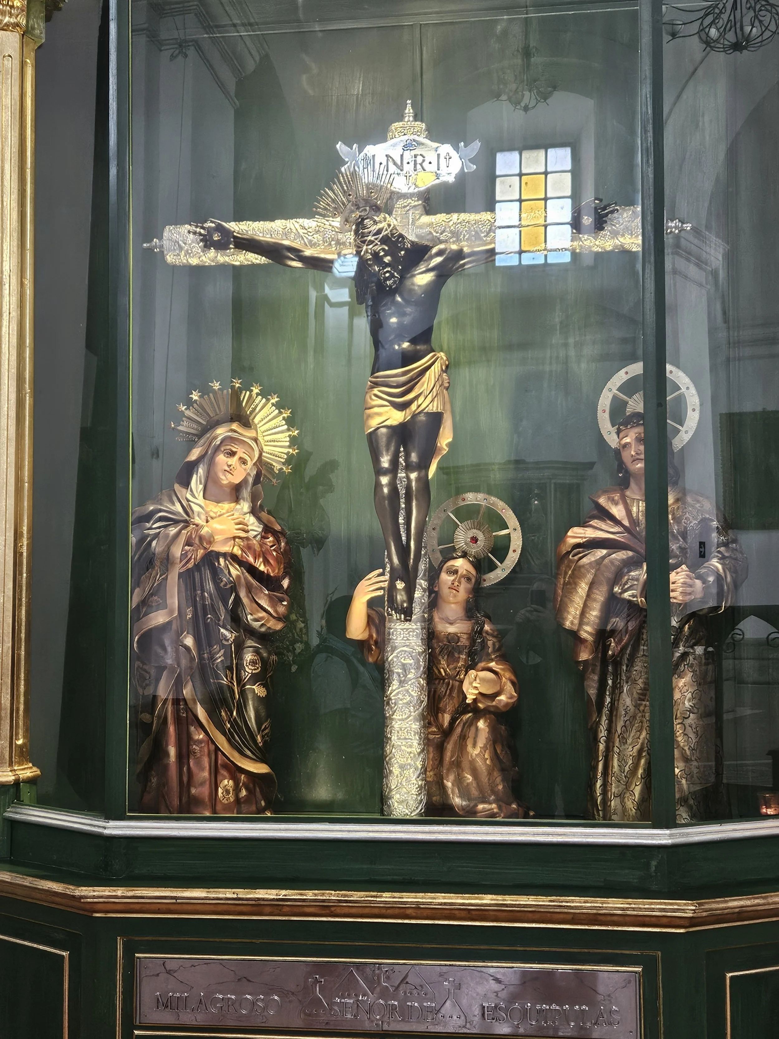 Black Jesus. The story goes that when the Spanish were in Guatemala they would make fun of the indigenous people telling them that God didn't love them and that it was obvious because the indigenous people didn't have a Jesus/God with the same skin color as them. This made them sad so they went to speak to their spiritual leader who suggested they host a celebration of their faith so that God could show them his love. The result was that they came up with this image of black Jesus. It's believed the black color was a result of soot from the fire at their celebration and it stuck.