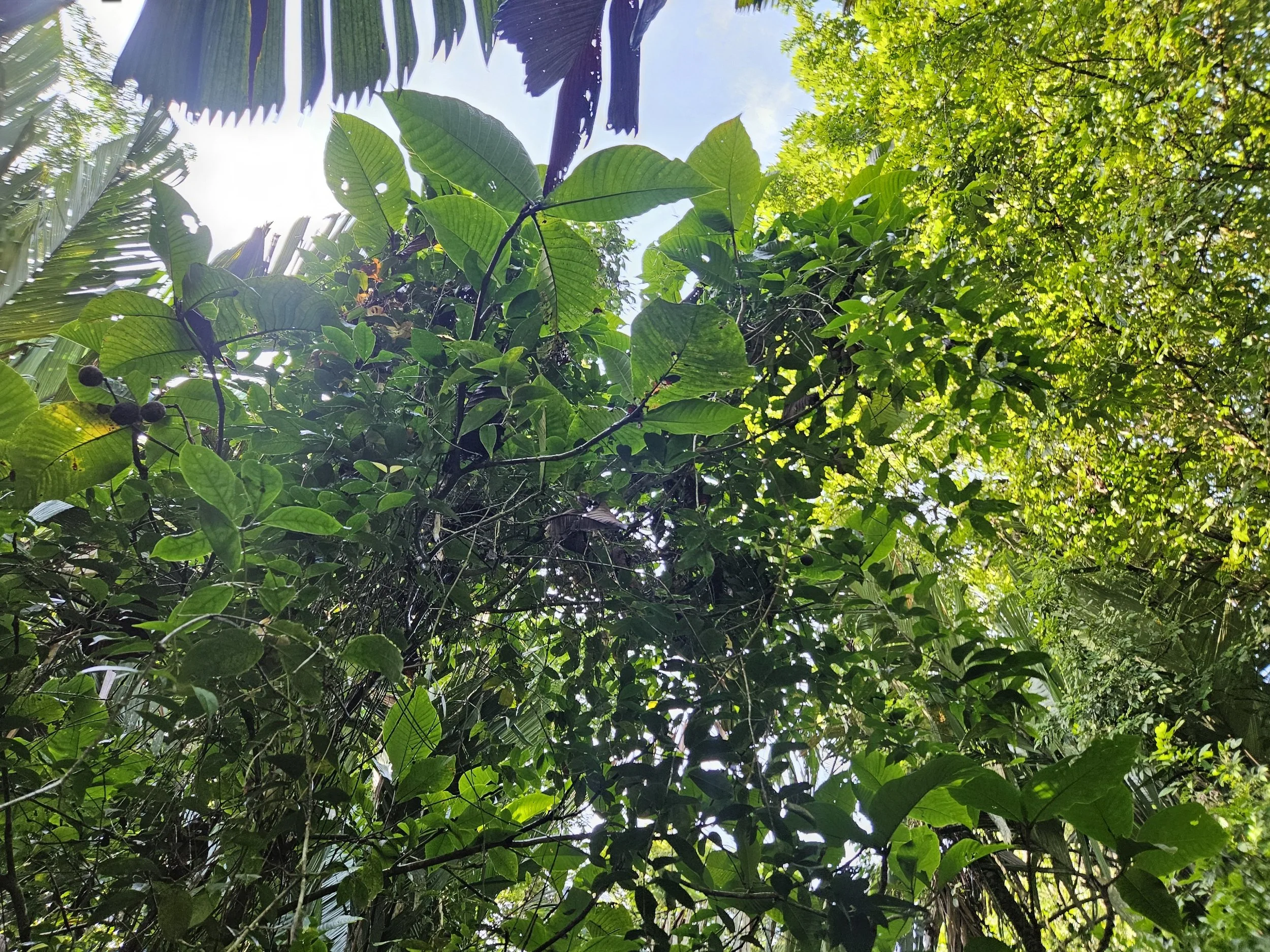 All the plants were large and many had roots coming down from the canopy to lock them into edge of whatever soil they found when they became situated. The buttress roots from the base and the canopy or arboreal roots from the limbs serve to stabilize and take in resources.