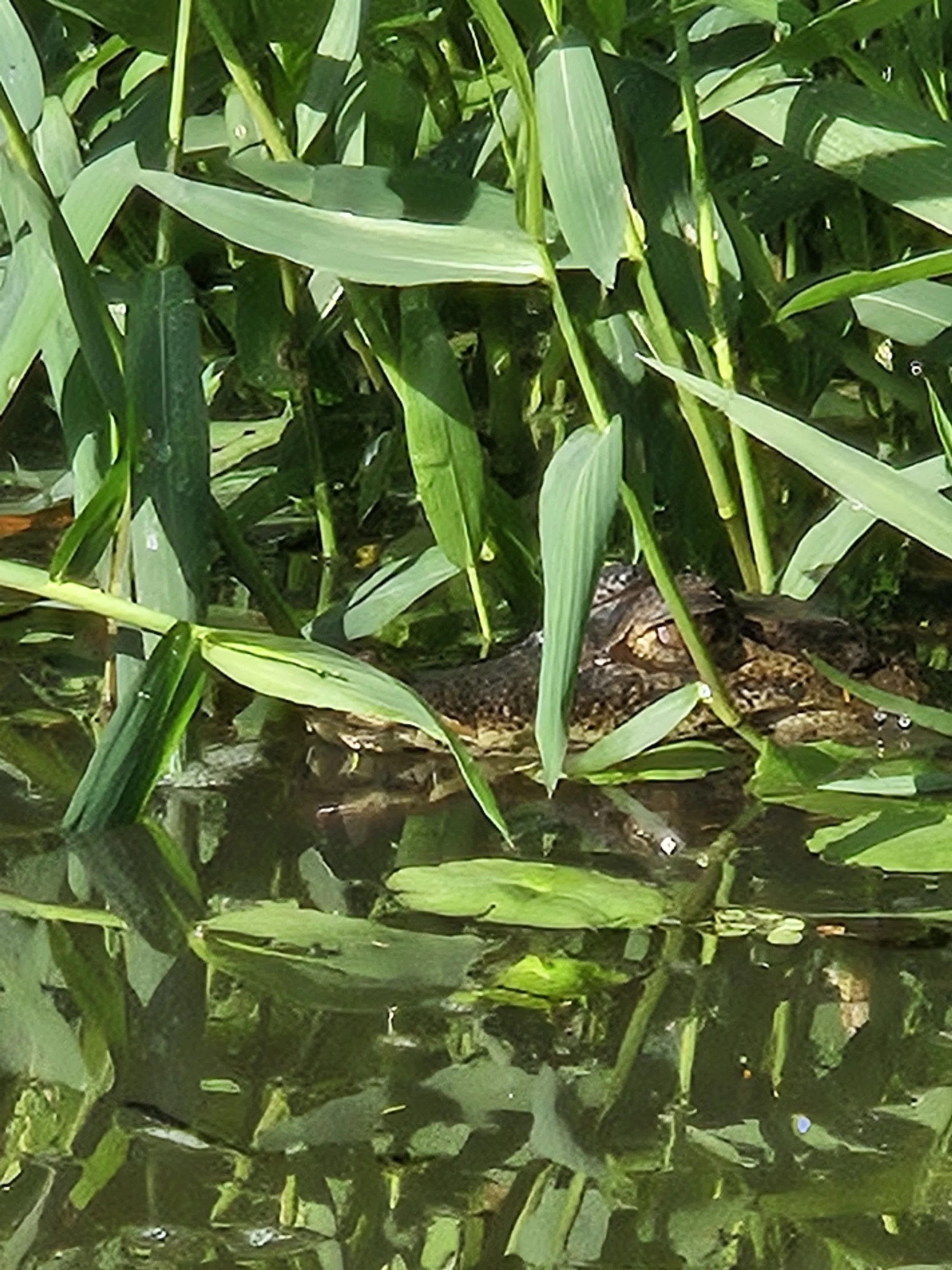 Some caimans chilling just at the surface. These are two great examples of using camouflage and/or environment to reduce your visibility.